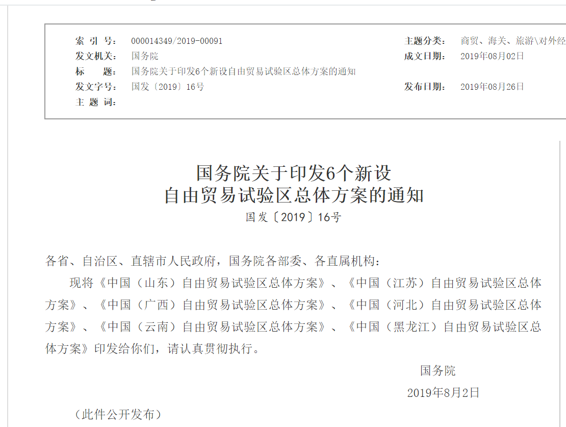 国务院新设6个自由贸易试验区总体方案 5个方案
