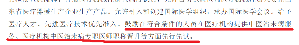 《中国(山东)自由贸易试验区总体方案》提出,鼓励符合条件的人员在医疗机构提供中医治未病服务、医疗机构中医治未病专职医师职称晋升等方面先行先试。