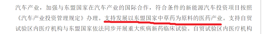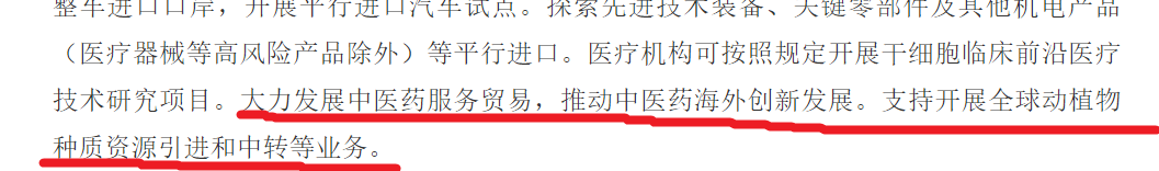 《中国(云南)自由贸易试验区总体方案》提出大力发展中医药服务贸易,推动中医药海外创新发展。支持开展全球动植物种质资源引进和中转等业务。支持建设现代化中药研发平台。